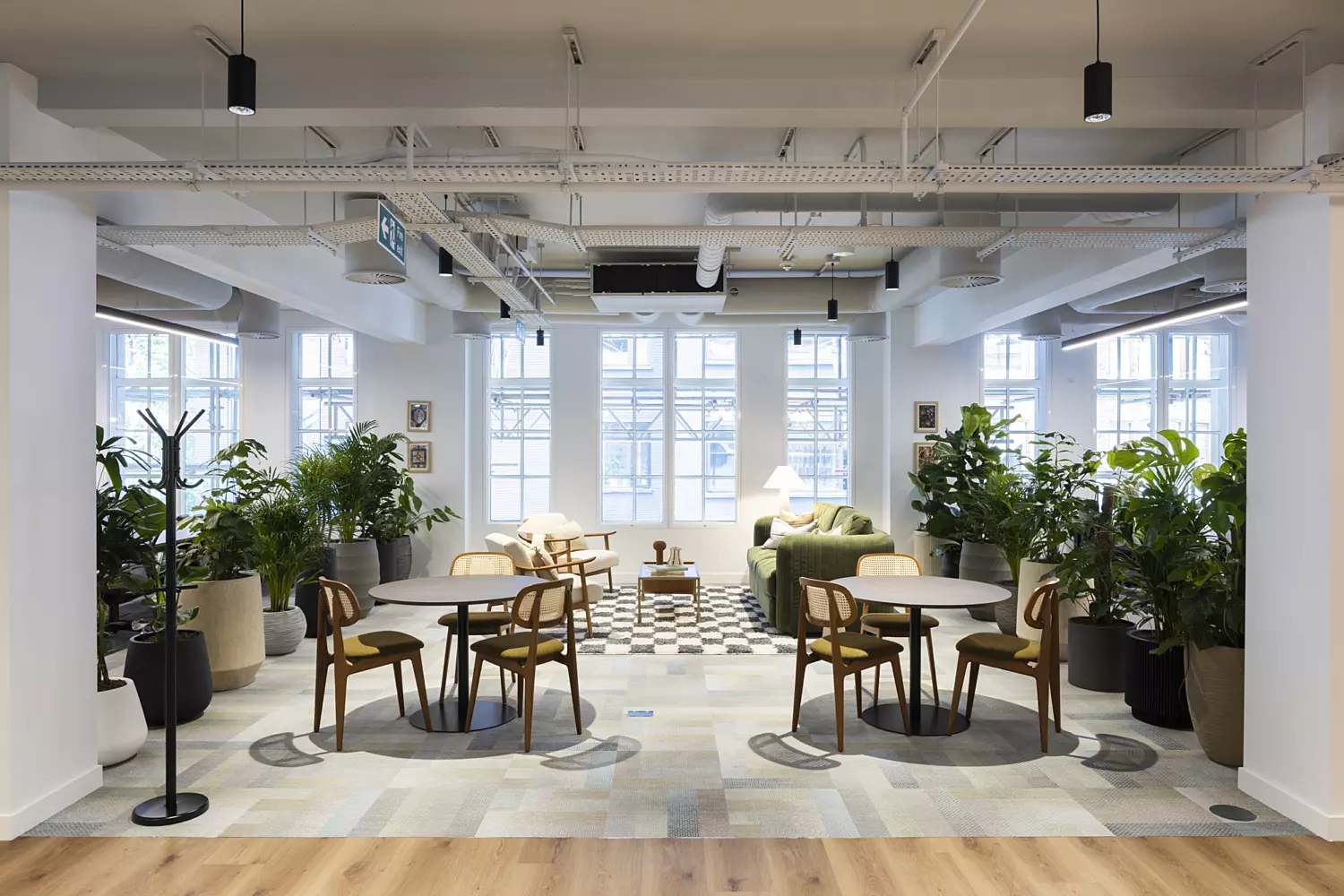 Over in the teapoint, lit by custom hanging light planters, we’ve used 3D ceramic tiles that are made from 70% recycled materials. Whilst in other communal areas, innovative carpet tiles with their own non-damaging adhesive are a real win for making sure when the time does come to remove them, they won't leave a mark.